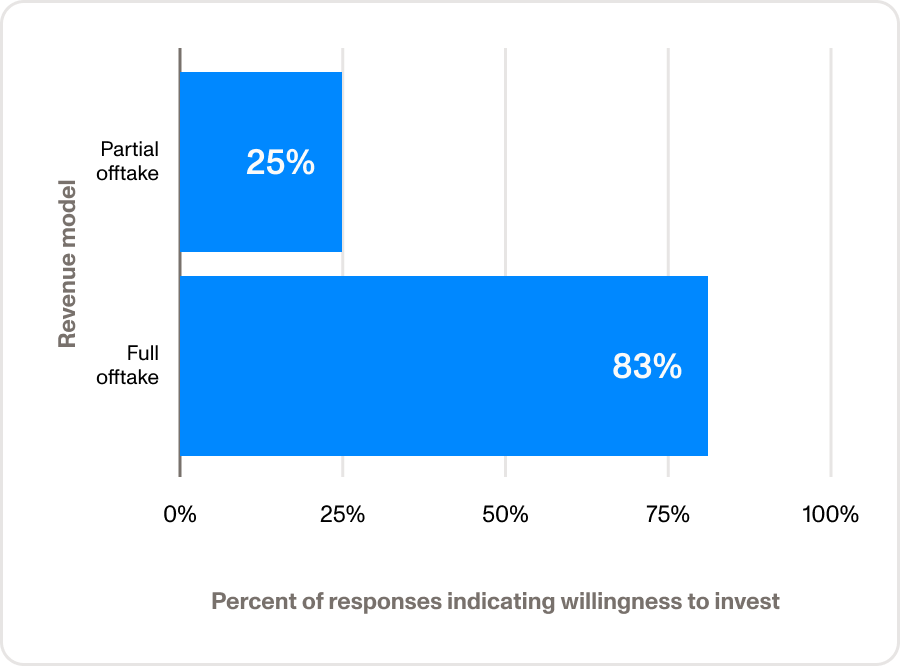 Why: Lenders and investors strongly prefer fully contracted projects, where long-term offtake agreements reduce revenue uncertainty and strengthen repayment confidence. Crux analysis shows 83% of investors are willing to consider fully contracted projects, compared to just 25% for partially contracted ones. This trend is consistent across both lending and tax equity markets.